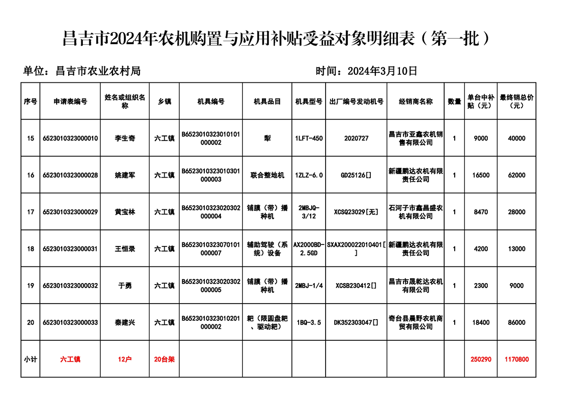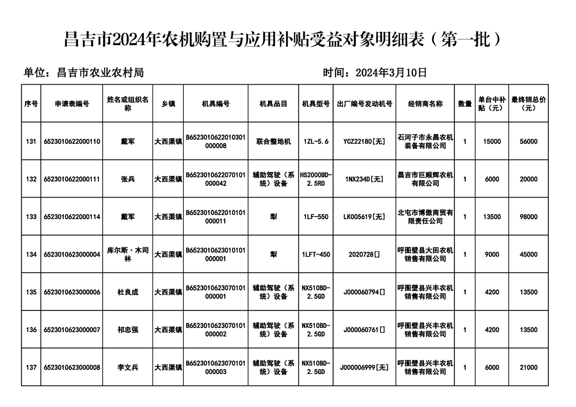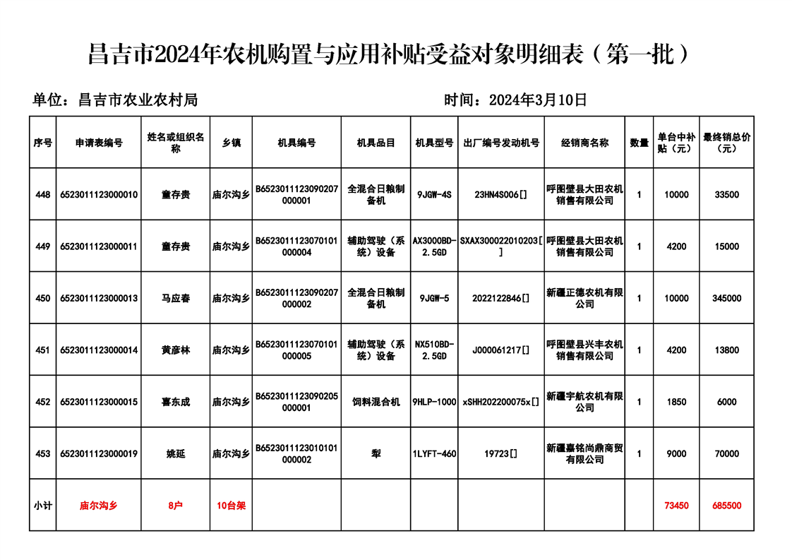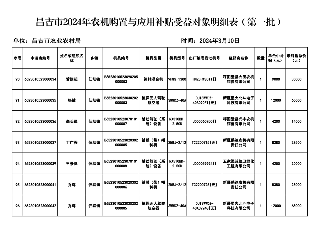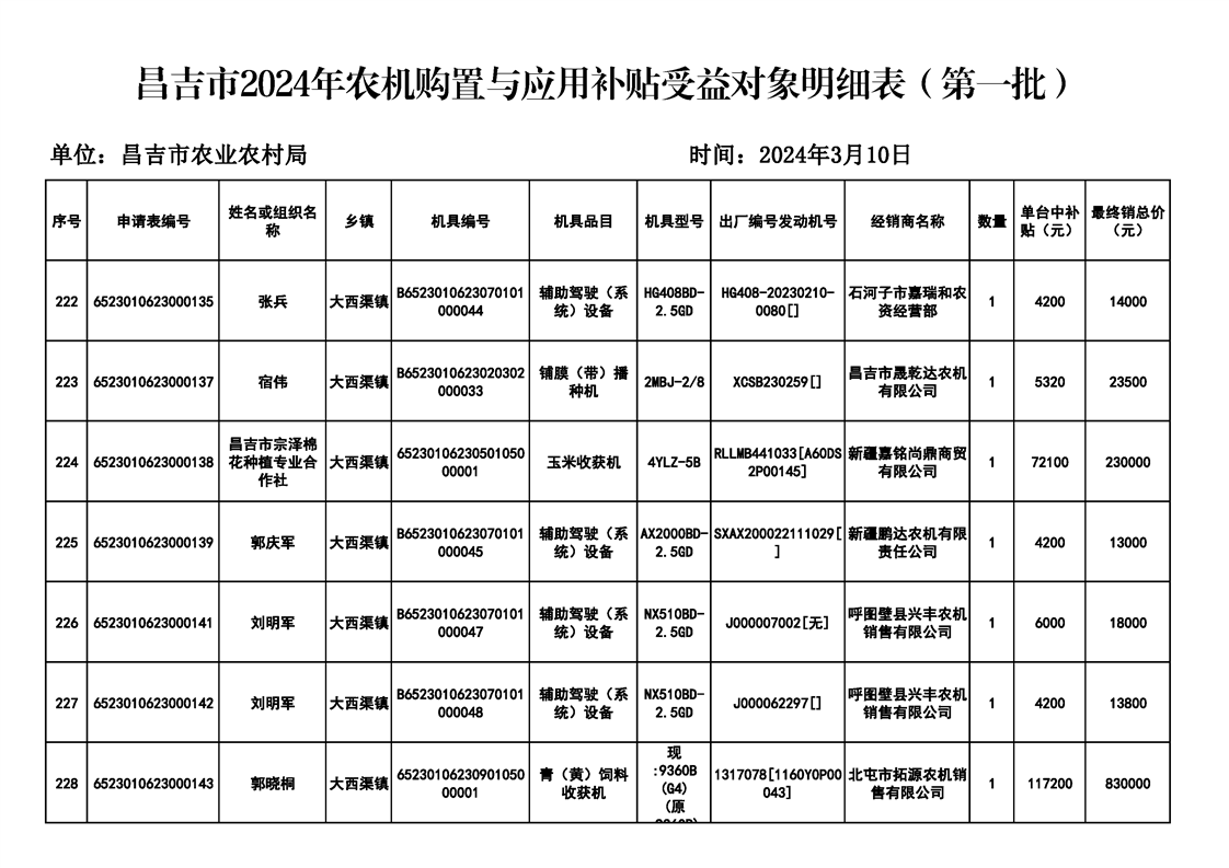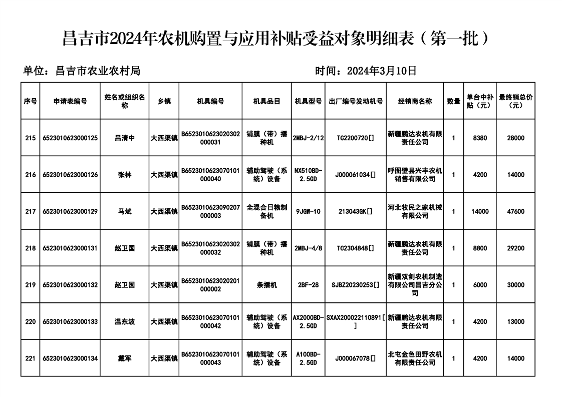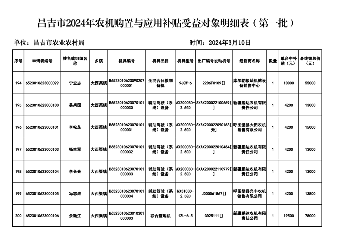 | 名 称 | 【涉农补贴结果】昌吉市2024年农机购置与应用补贴受益对象明细表(第一批) | ||