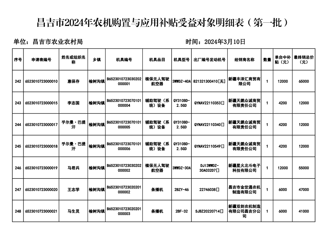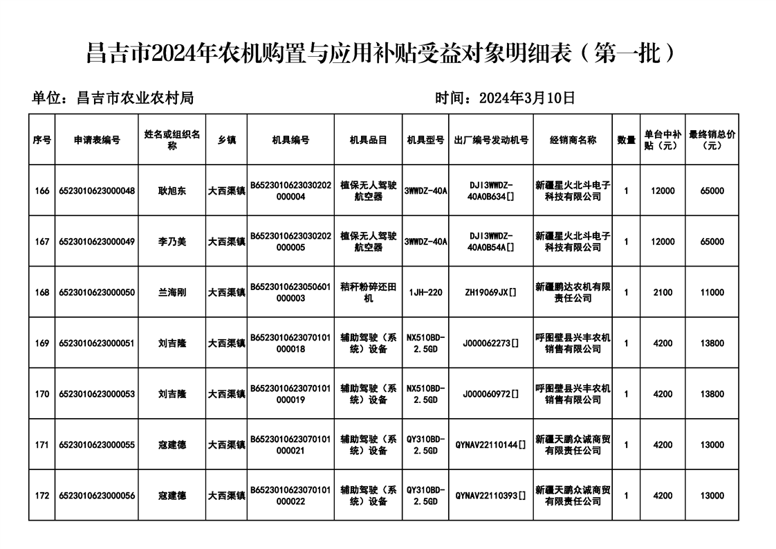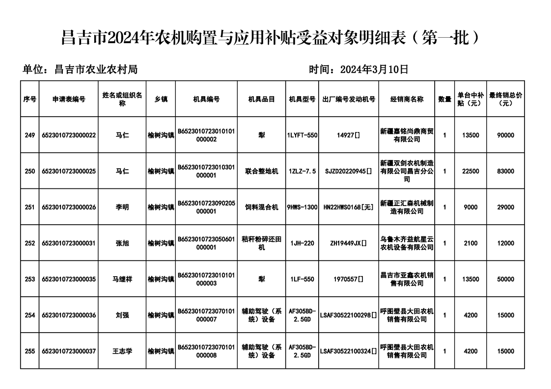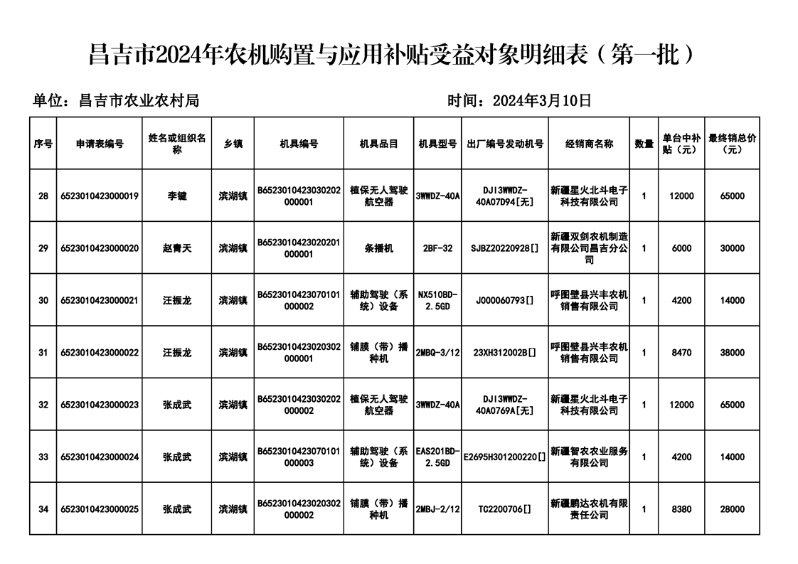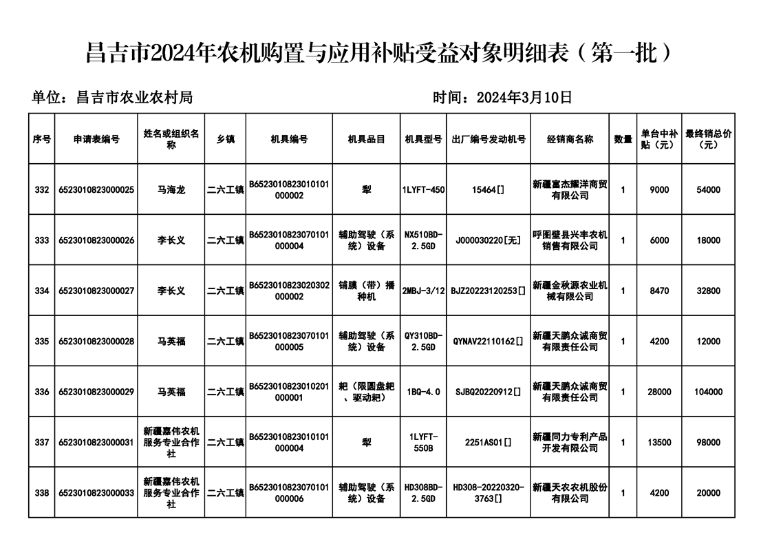 【涉农补贴结果】昌吉市2024年农机购置与应用补贴受益对象明细表(第一批)