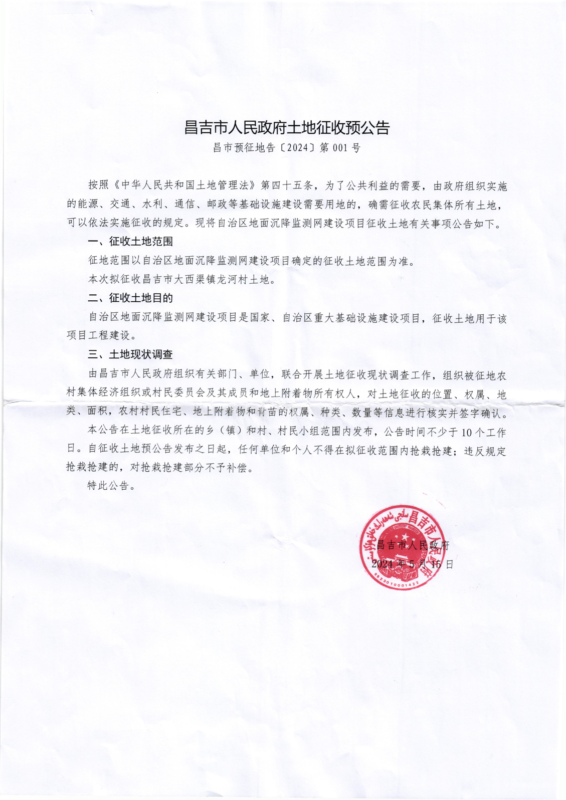 | 名 称 | 昌市预征地告[2024]第001号 | ||