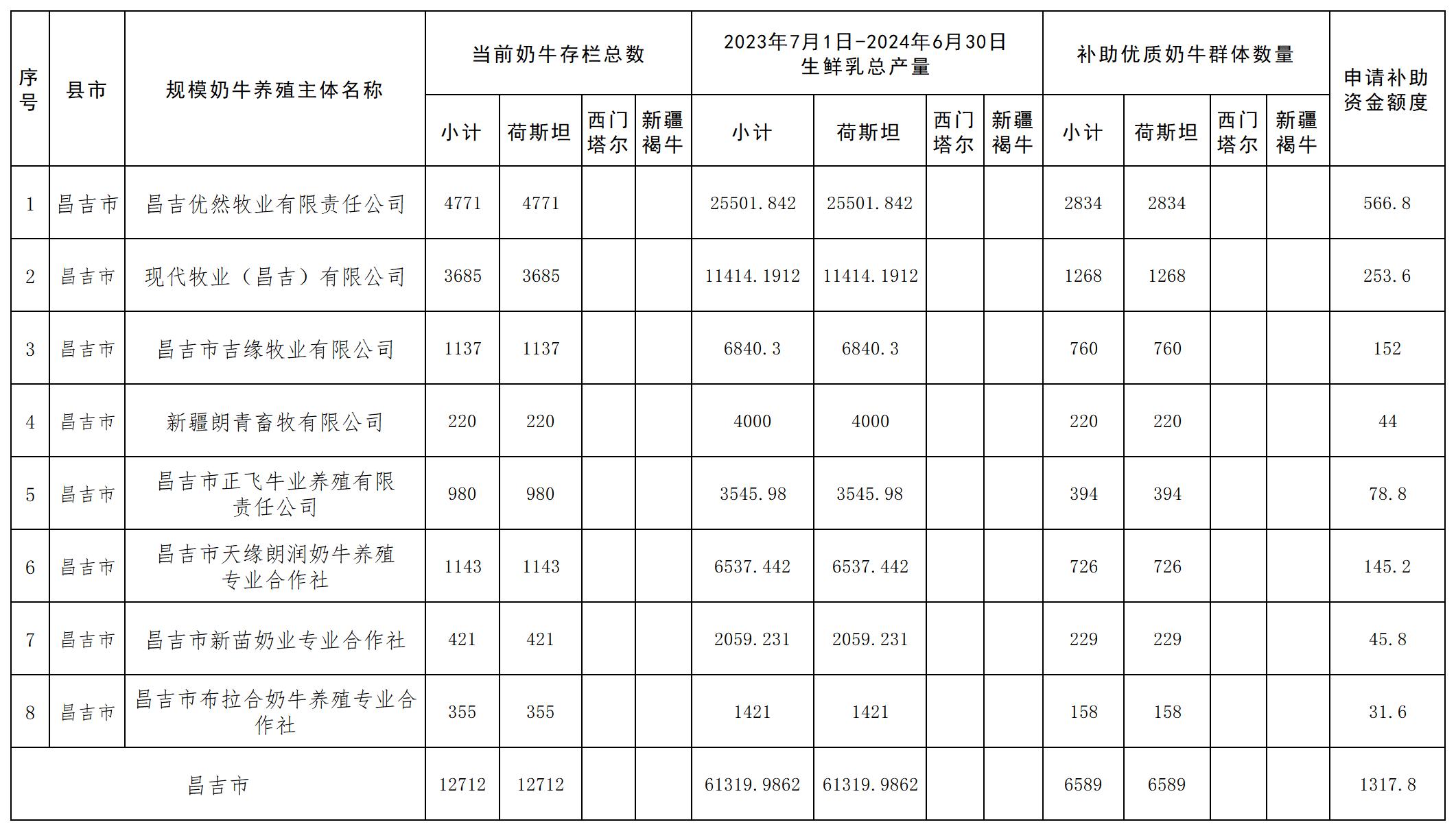 【涉农补贴结果】昌吉市2024年优质奶牛养殖补贴资金公示