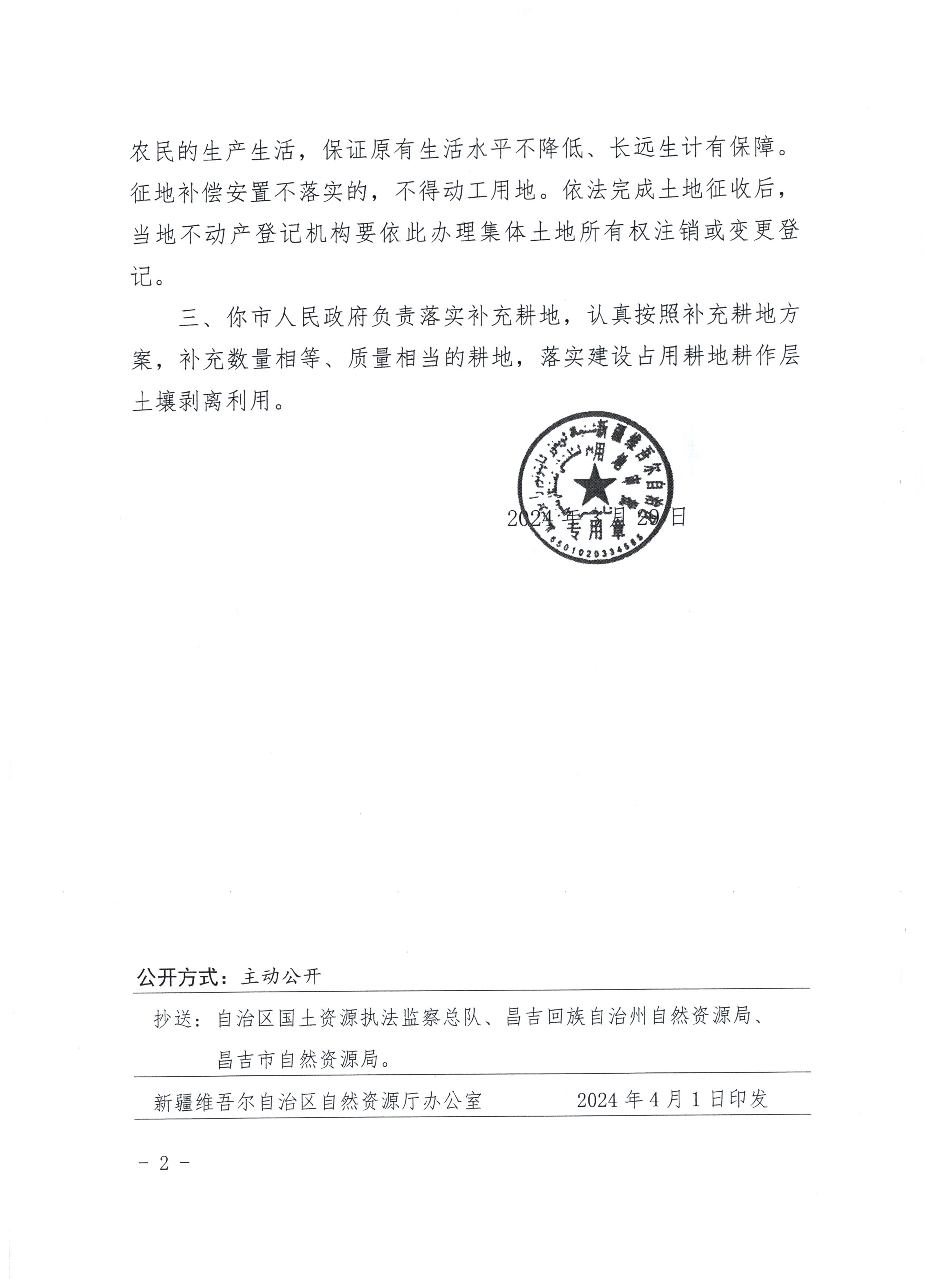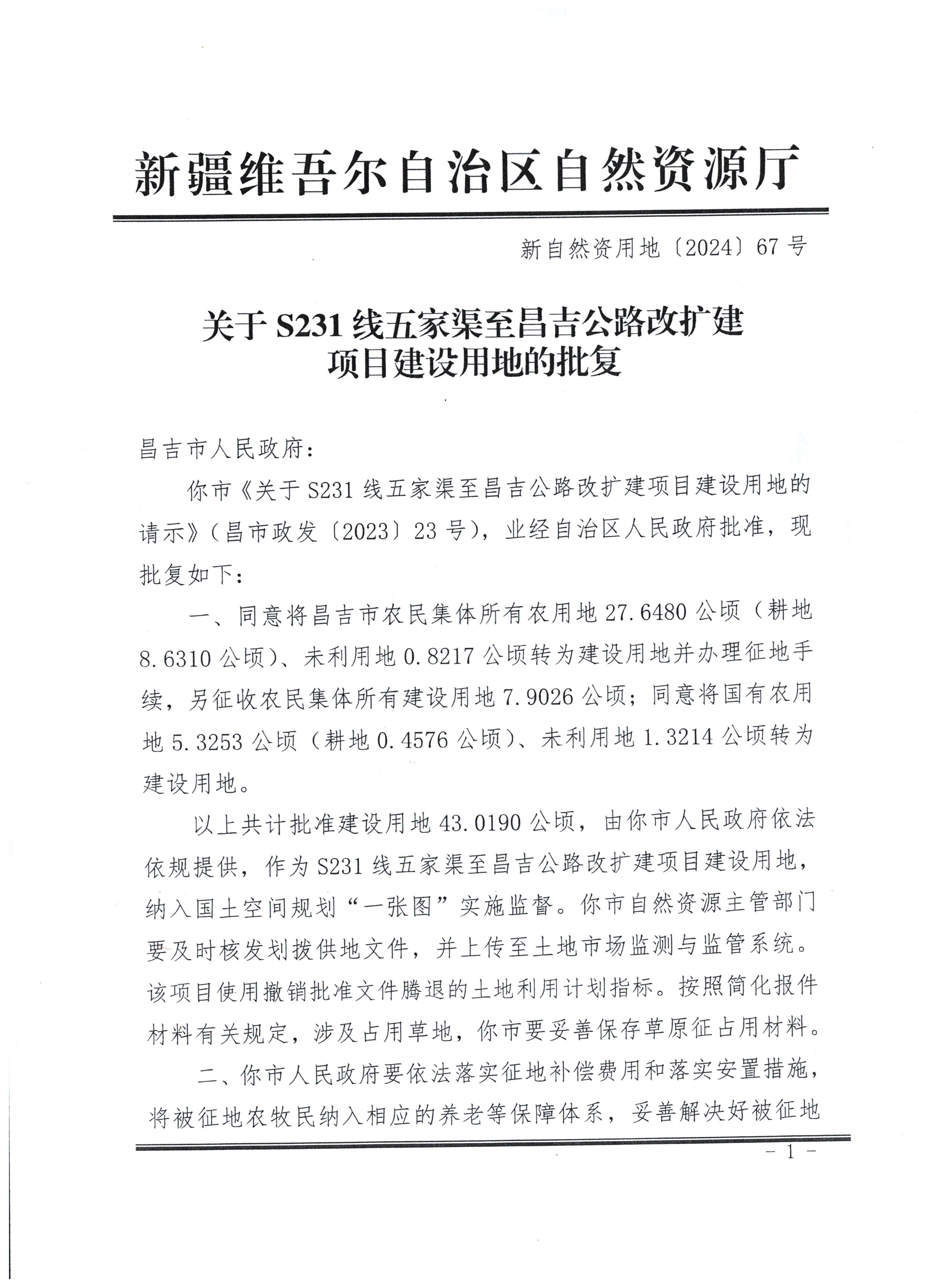 【国有及集体土地审批结果】S231线五家渠至昌吉公路改扩建项目建设用地的批复
