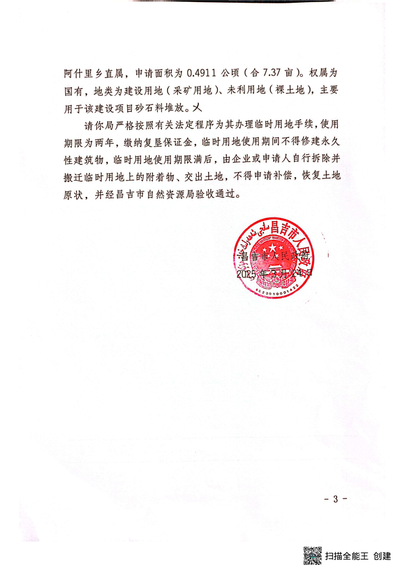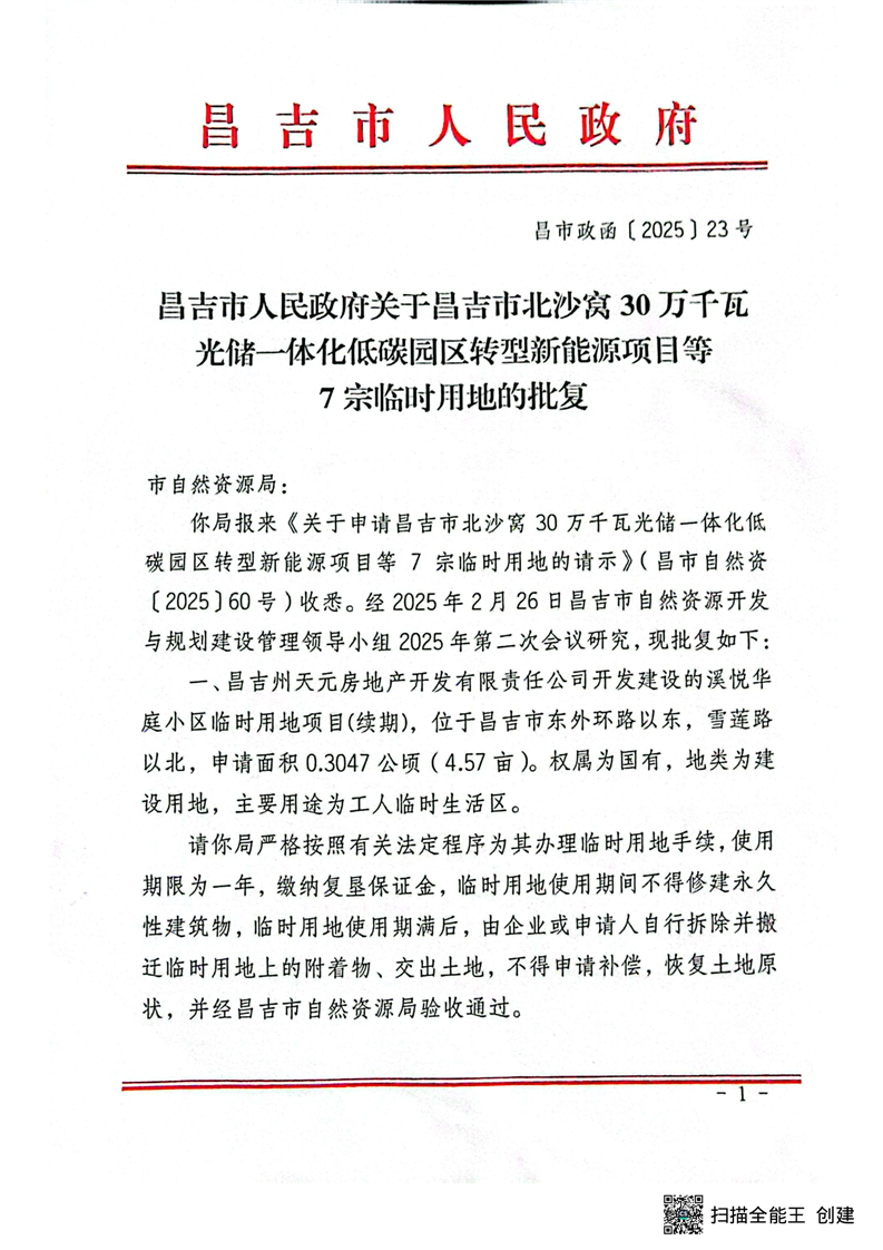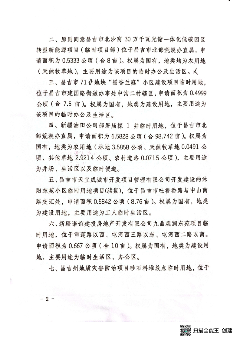 | 名 称 | 昌吉市人民政府关于昌吉市北沙窝30万千瓦光储一体化低碳园区转型新能源项目等7宗临时用地的批复 | ||