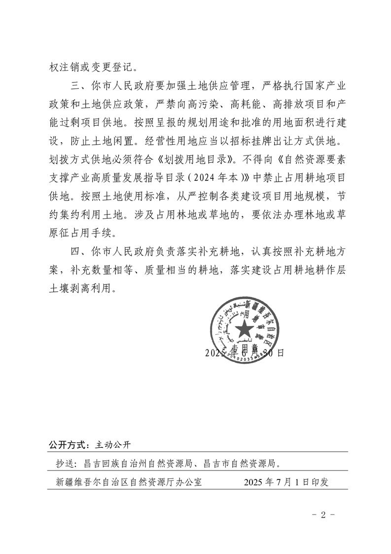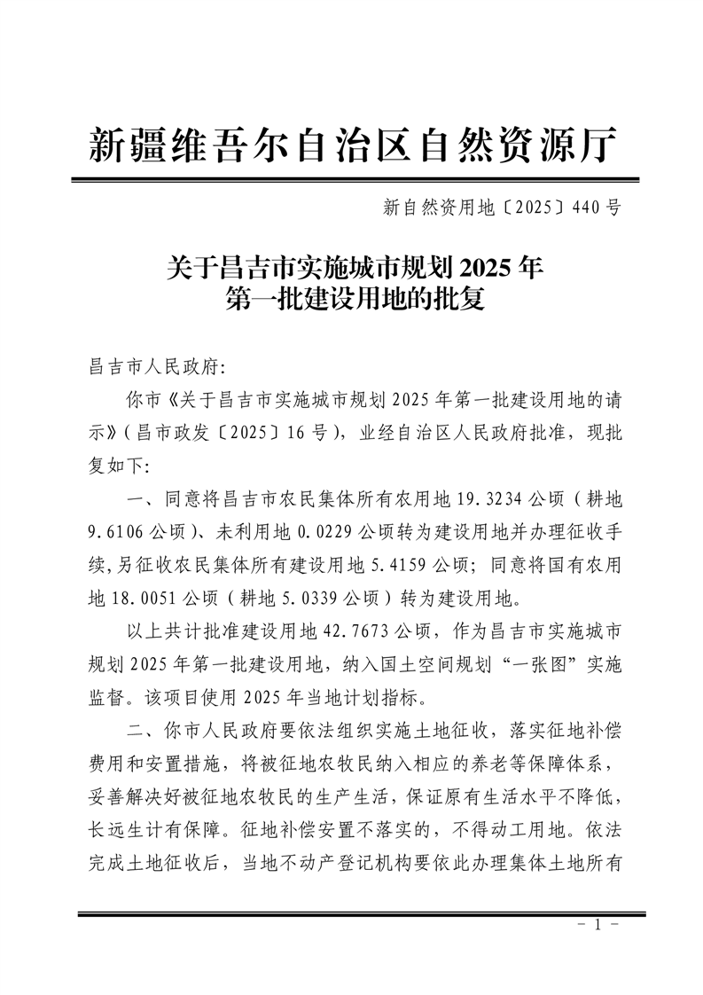 | 文 号 | 新自然资用地[2025]440号 | 主 题 词 | 建设用地 审批 昌吉市 城市规划 2025 |