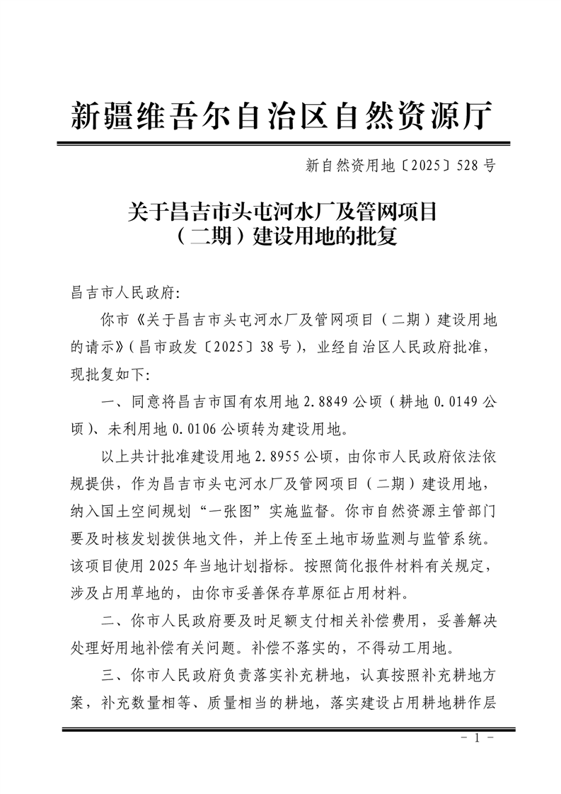 | 文 号 | 新自然资用地〔2025〕528 号 | 主 题 词 | 建设用地 审批 昌吉市 头屯河 水厂 建设项目 |