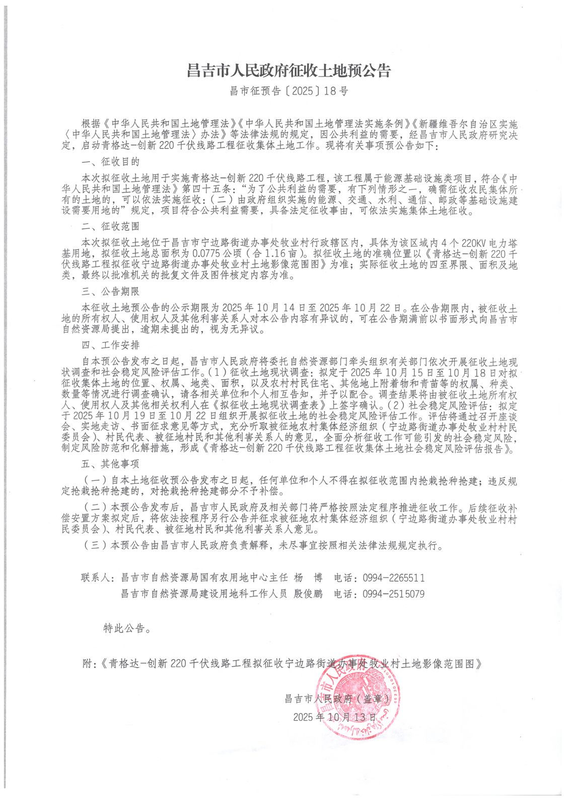 宁边路街道办事处牧业村-青格达-创新220千伏线路工程-昌吉市人民政府征收土地预公告 昌市征预告〔2025〕018号