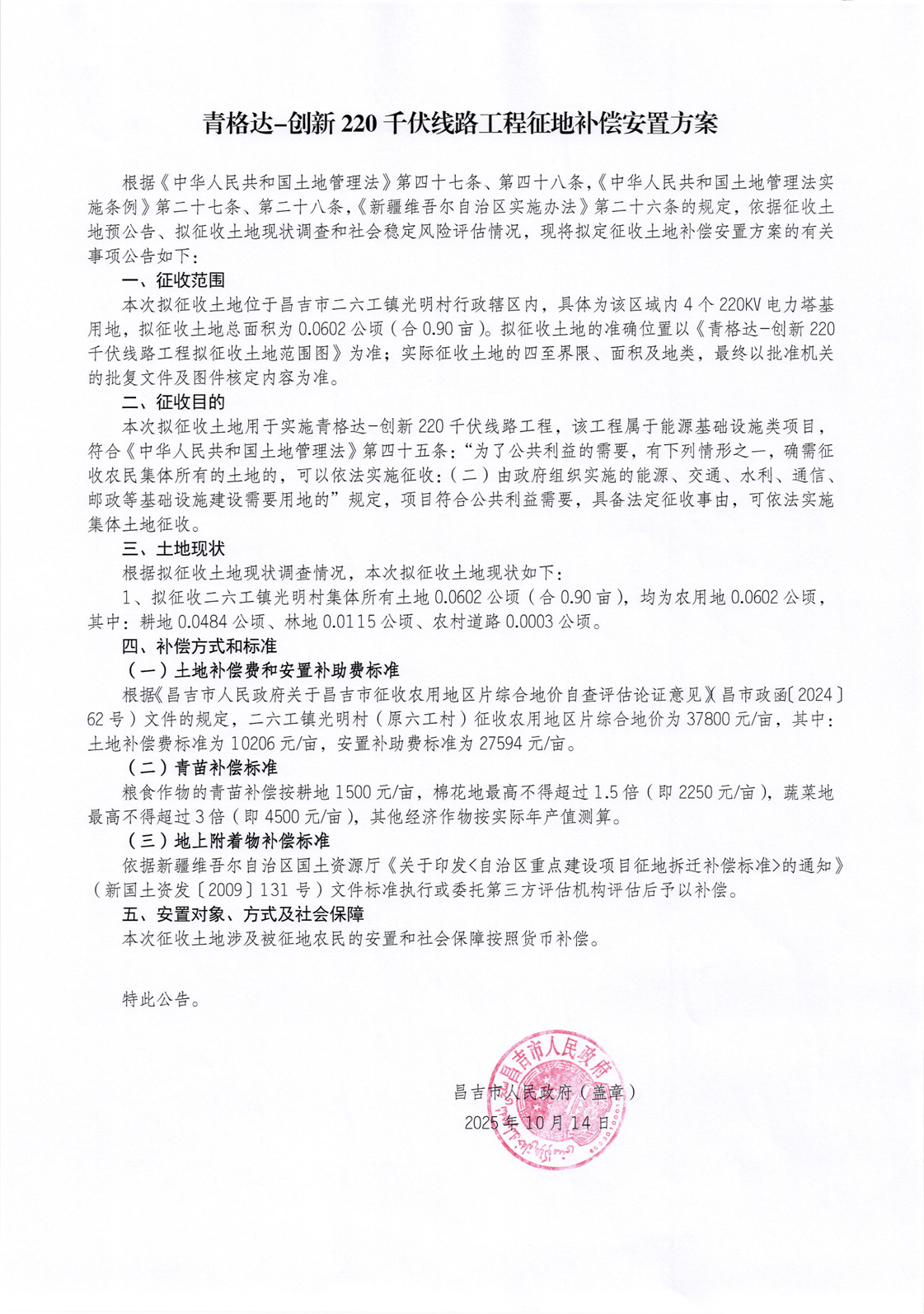 二六工镇光明村-青格达-创新220千伏线路工程-昌吉市人民政府征地补偿安置方案