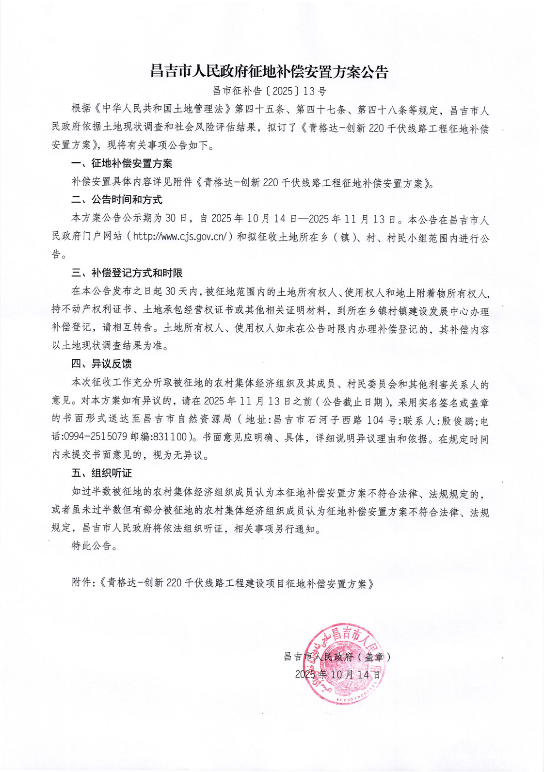 佃坝镇土梁村-青格达-创新220千伏线路工程-昌吉市人民政府征地补偿安置方案公告