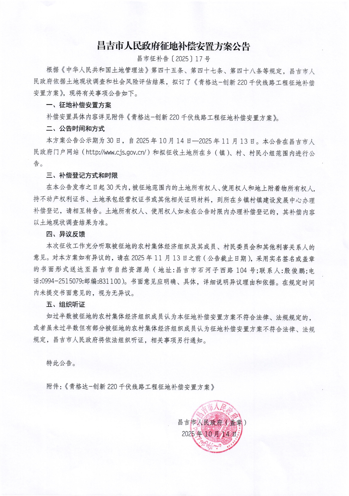 二六工镇红星村-青格达-创新220千伏线路工程-昌吉市人民政府征地补偿安置方案公告 昌市征补告〔2025〕17号