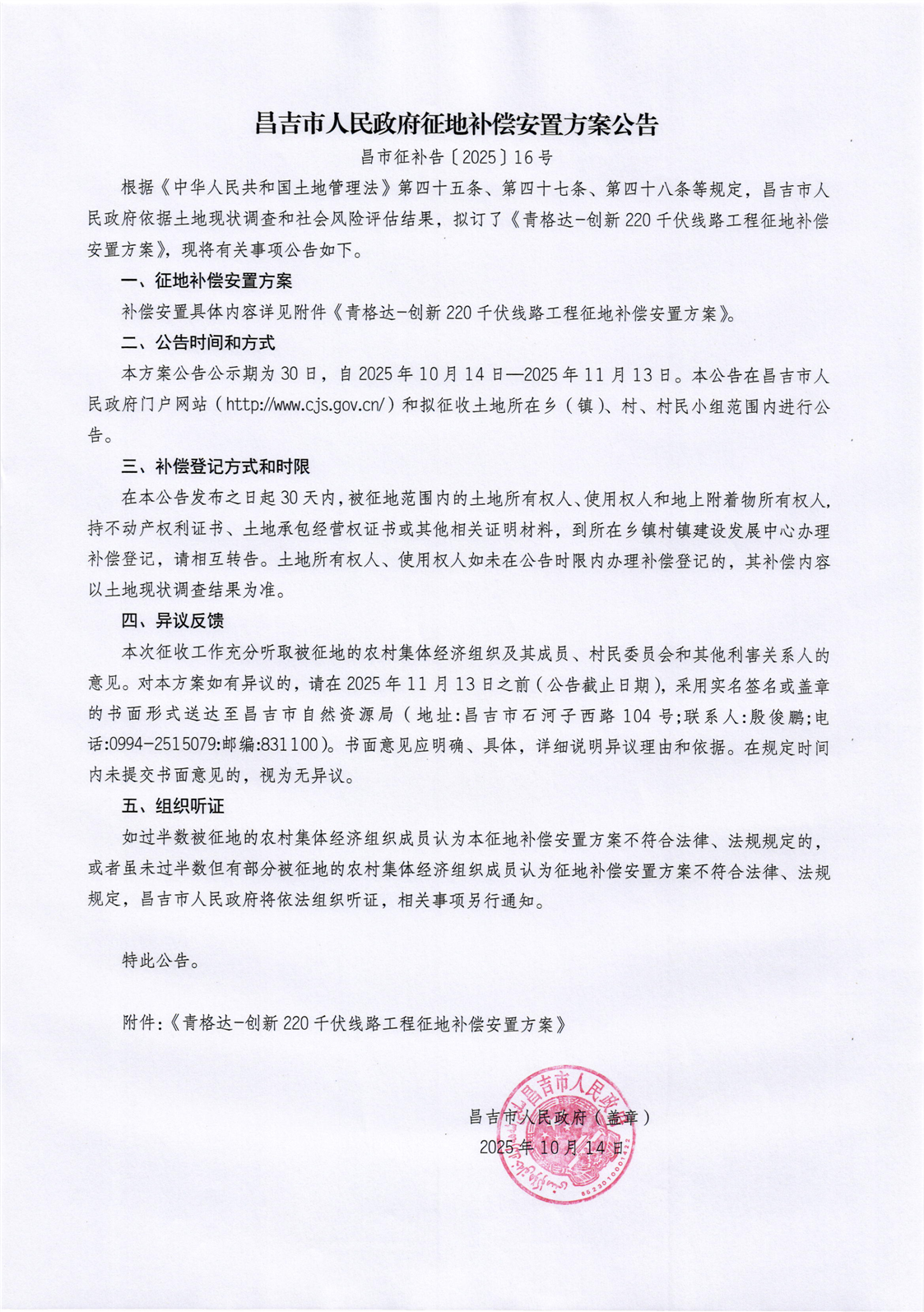 二六工镇十二份村-青格达-创新220千伏线路工程-昌吉市人民政府征地补偿安置方案公告