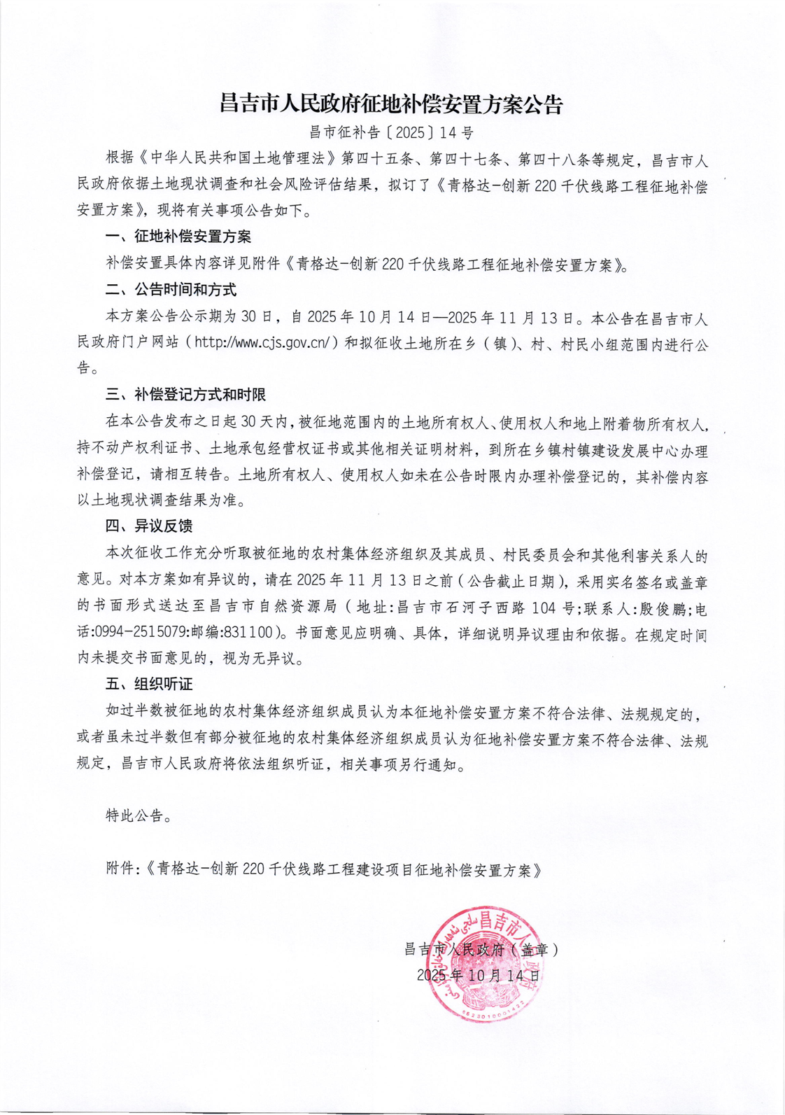 二六工镇下六工村-青格达-创新220千伏线路工程-昌吉市人民政府征地补偿安置方案公告