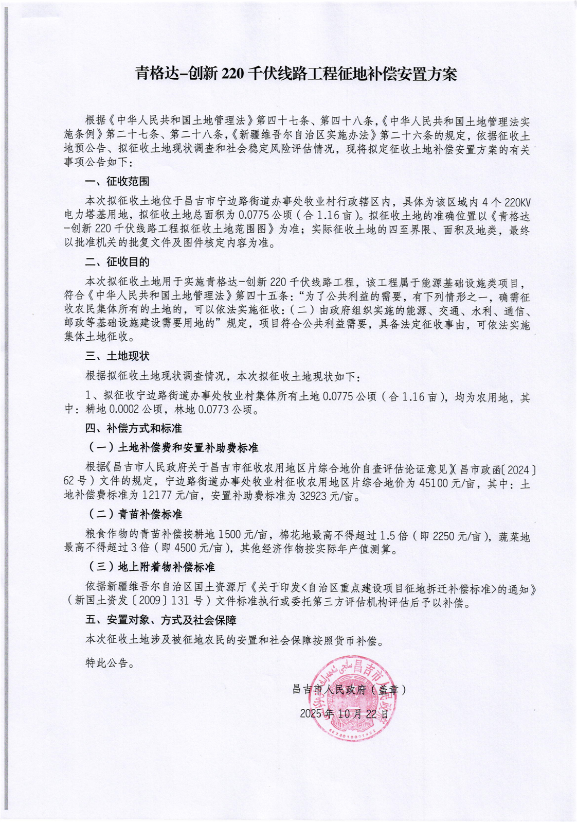 根据《中华人民共和国土地管理法》《中华人民共和国土地管理法实施条例》《新疆维吾尔自治区实施〈中华人民共和国土地管理法〉办法》等法律法规的规定,因公共利益的需要,经昌吉市人民政府研究决定,启动青格达-创新220千伏线路工程征收集体土地工作。现将有关事项预公告如下: