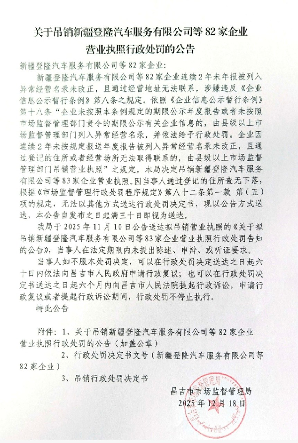 关于吊销新疆登隆汽车服务有限公司等82家企业 营业执照行政处罚的公告