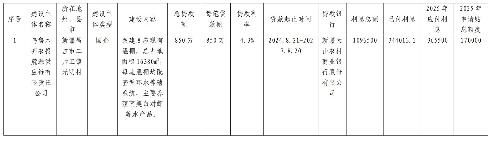 根据新农计函〔2025〕585号《关于印发<自治区2025年现代设施农业建设贷款贴息实施方案>的通知》要求,2025年10月,自治区启动现代设施农业建设贷款贴息申报工作,我市组织对符合条件的养殖主体进行摸底。经审核,符合现代设施农业建设贷款贴息申报条件的养殖主体(设施渔业)1个,为乌鲁木齐农投麓源供应链有限责任公司,贷款本金850万元,用于二六工镇光明村水产养殖基地建设,申请贴息金额17万元。为保证贷款贴息资金公开、公正、透明,现将昌吉市2025年自治区现代设施农业建设贷款贴息资金情况进行公示(附表),公示期五天(2026 年3月9日—3 月13日,5个工作日),如对公示内容有意见建议的,可向昌吉市农业农村局畜牧科反映。联系电话:0994-2596577,联系人:谷瑞娟、苏林海。
