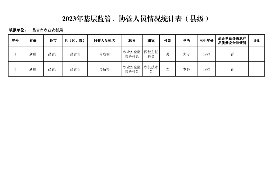 2023年昌吉市农产品质量安全基层监管协管人员情况统计表(县级)