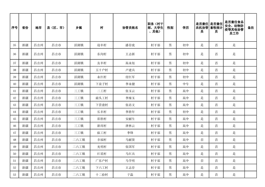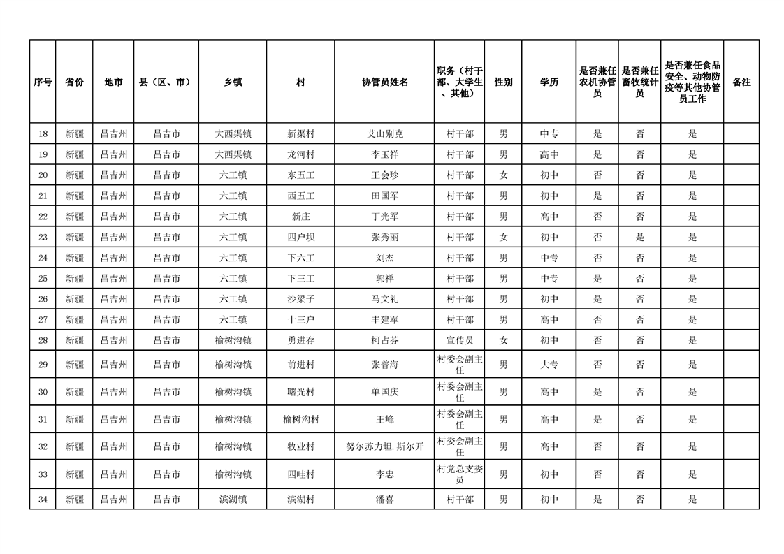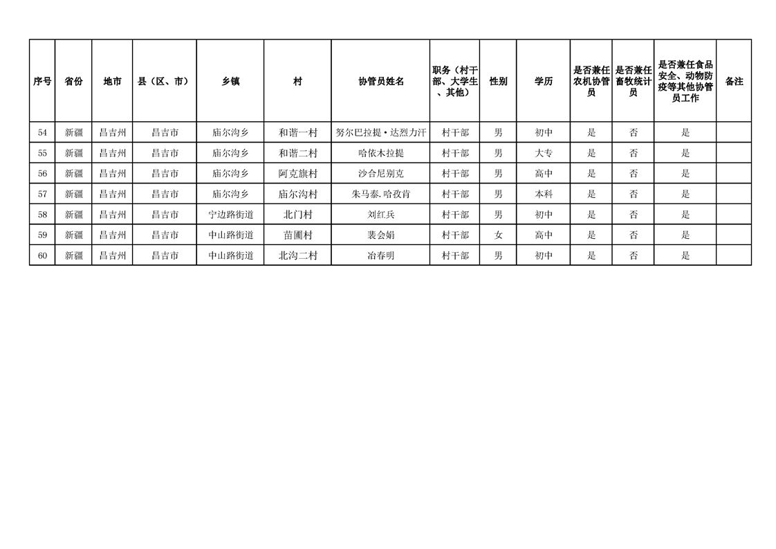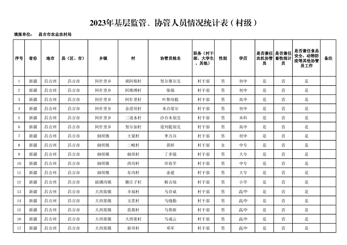 2023年昌吉市农产品质量安全基层监管协管人员情况统计表(村级)