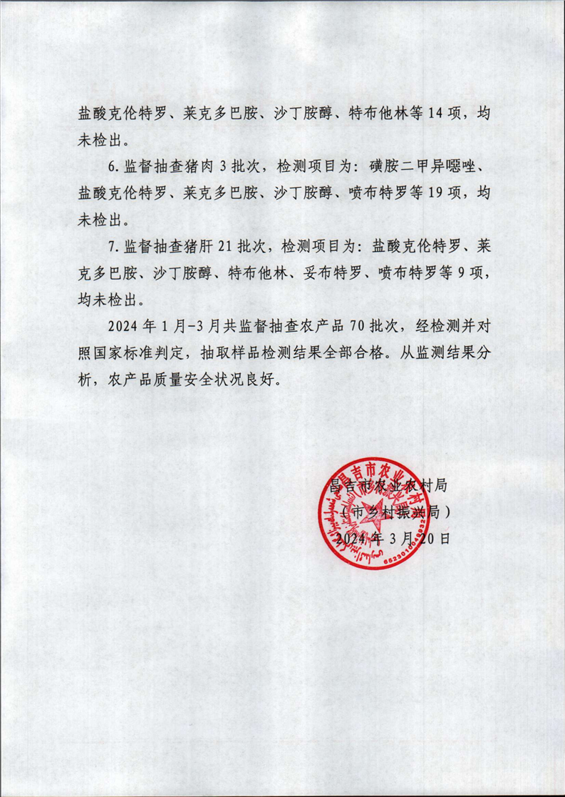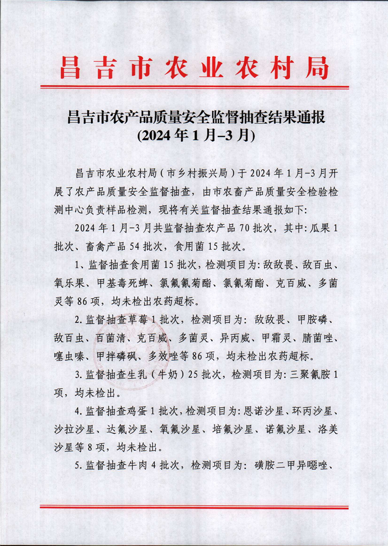 昌吉市农产品质量安全监督抽查结果通报(2024年1月-3月)