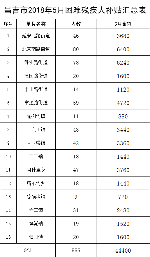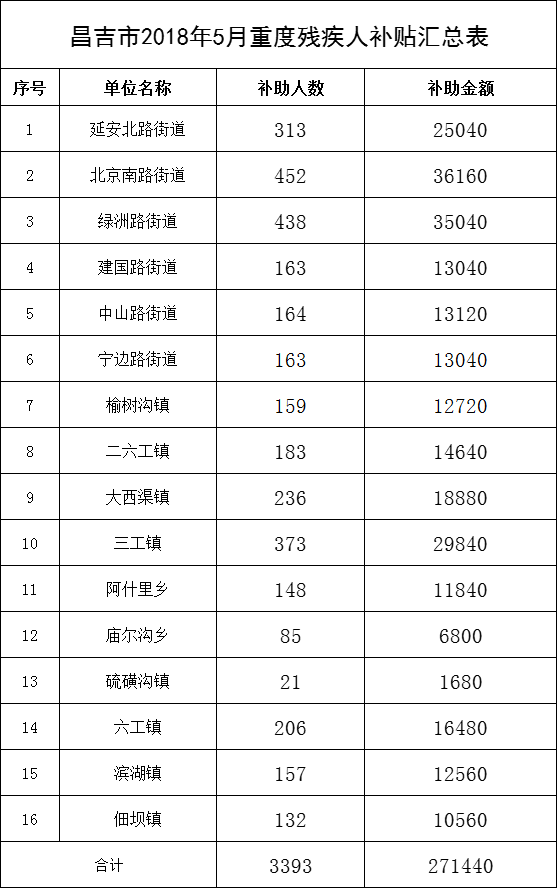 | 名 称 | 昌吉市2018年5月残疾人两项补贴汇总表 | ||
