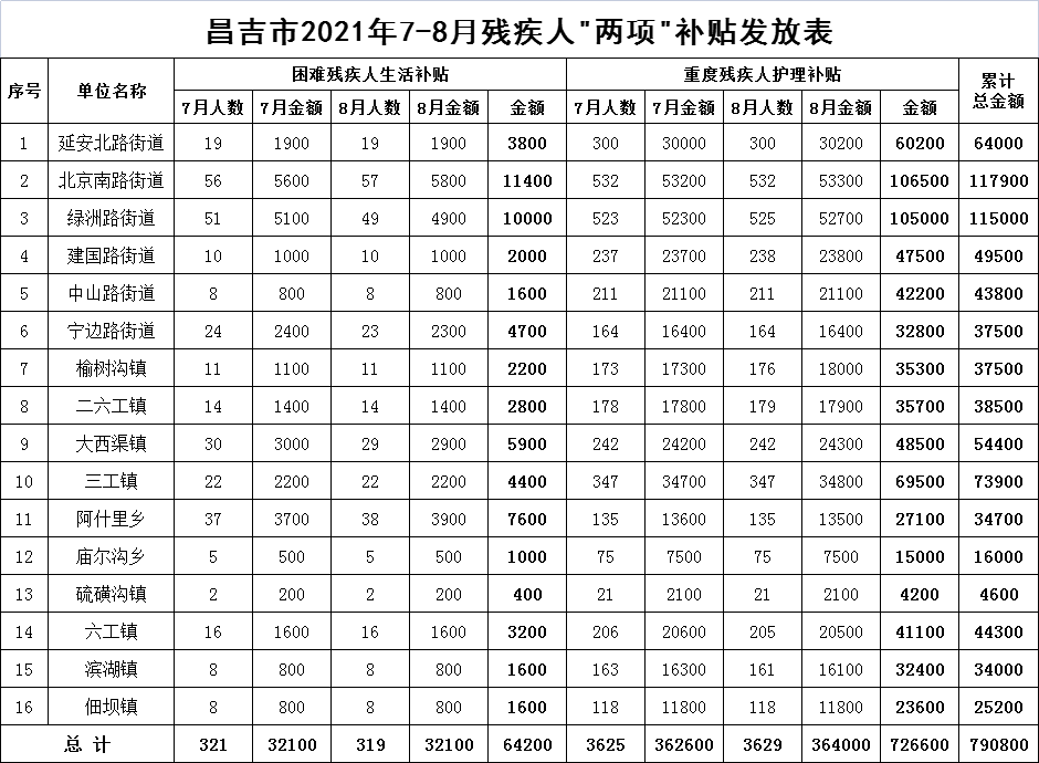昌吉市2021年7-8月残疾人"两项"补贴发放表