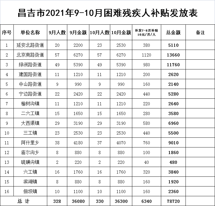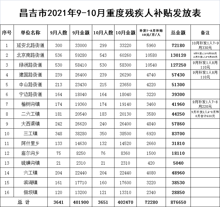 昌吉市2021年残疾人“两项”补贴发放表