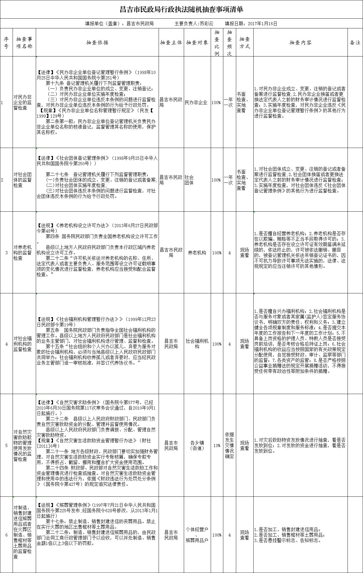 | 名 称 | 昌吉市民政局行政执法随机抽查事项清单 | ||