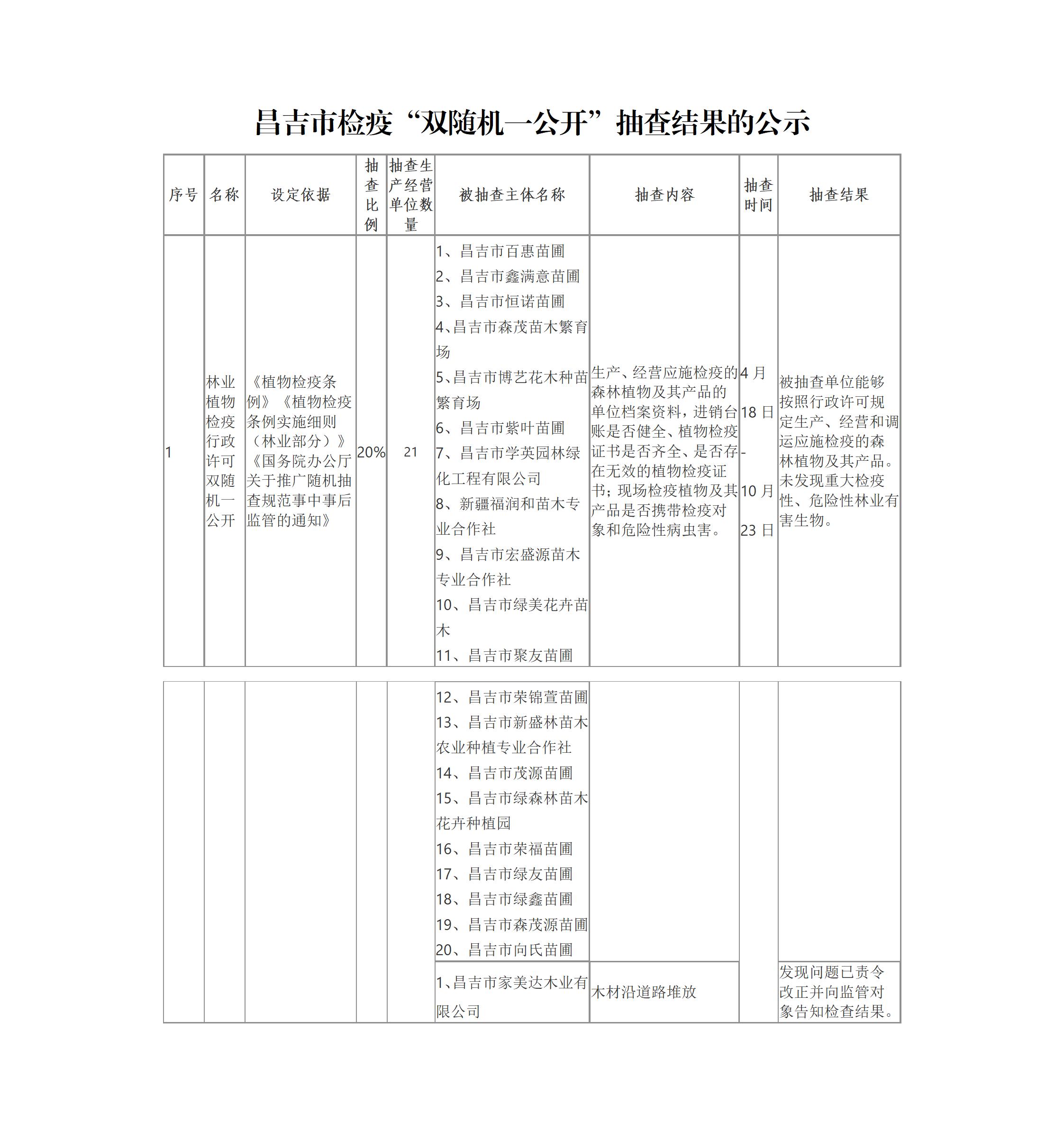 昌吉市检疫“双随机一公开”抽查结果的公示