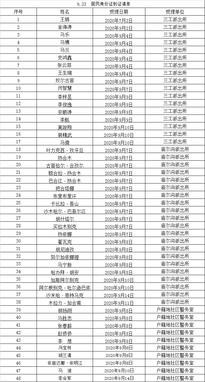 为做好“放管服”工作,昌吉市公安局改进工作薄弱环节,严格落实20个工作日的制发时限,近期在各派出所户籍窗口申请办理的身份证,已制作完成清单附后,如果名单里有您,可以前往指定地点领取。因自治区公安厅制作、寄发批次不同,如果您已申请但不在名单里,请继续关注,后续身份证制证情况将持续更新。