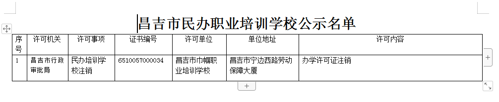 | 名 称 | 昌吉市民办职业培训学校公示名单 | ||