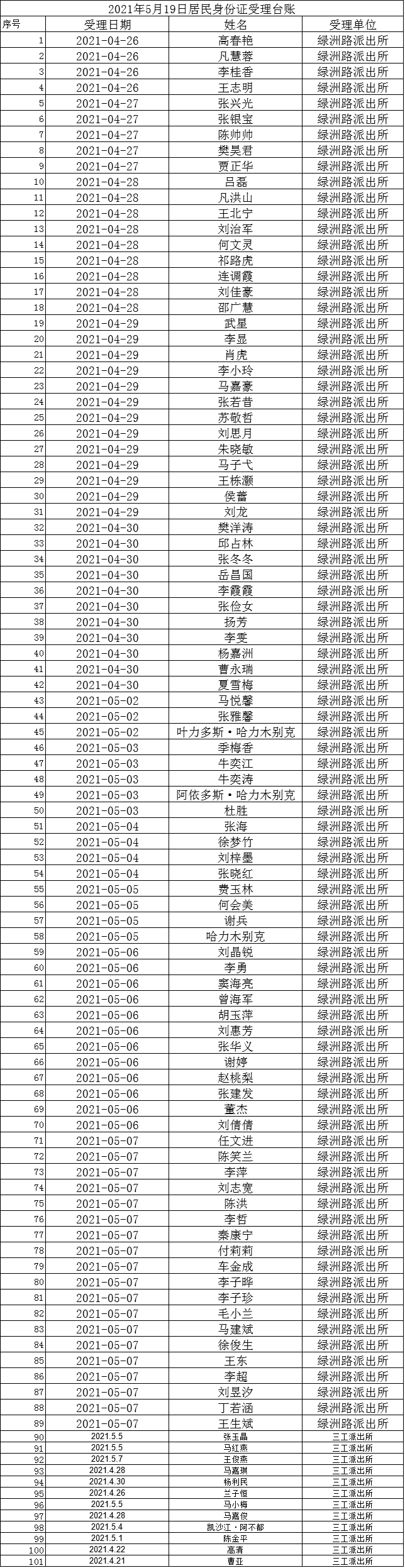 为做好“放管服”工作,昌吉市公安局改进工作薄弱环节,严格落实20个工作日的制发时限,近期在各派出所户籍窗口申请办理的身份证,已制作完成清单附后,如果名单里有您,可以前往指定地点领取。因自治区公安厅制作、寄发批次不同,如果您已申请但不在名单里,请继续关注,后续身份证制证情况将持续更新。