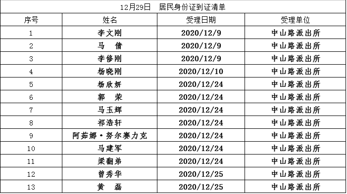 为做好“放管服”工作,昌吉市公安局改进工作薄弱环节,严格落实20个工作日的制发时限,近期在各派出所户籍窗口申请办理的身份证,已制作完成清单附后,如果名单里有您,可以前往指定地点领取。因自治区公安厅制作、寄发批次不同,如果您已申请但不在名单里,请继续关注,后续身份证制证情况将持续更新。