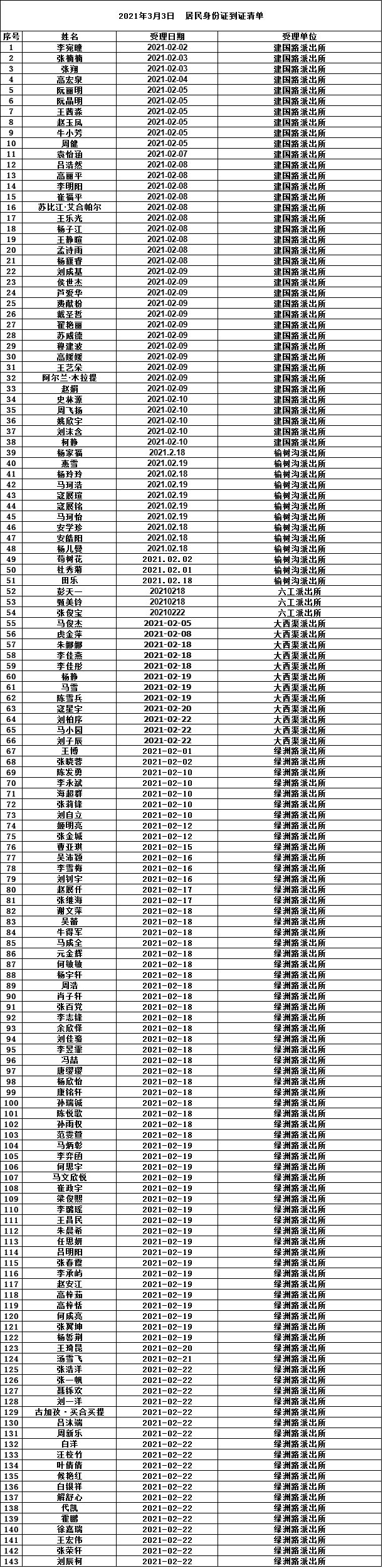 为做好“放管服”工作,昌吉市公安局改进工作薄弱环节,严格落实20个工作日的制发时限,近期在各派出所户籍窗口申请办理的身份证,已制作完成清单附后,如果名单里有您,可以前往指定地点领取。因自治区公安厅制作、寄发批次不同,如果您已申请但不在名单里,请继续关注,后续身份证制证情况将持续更新。