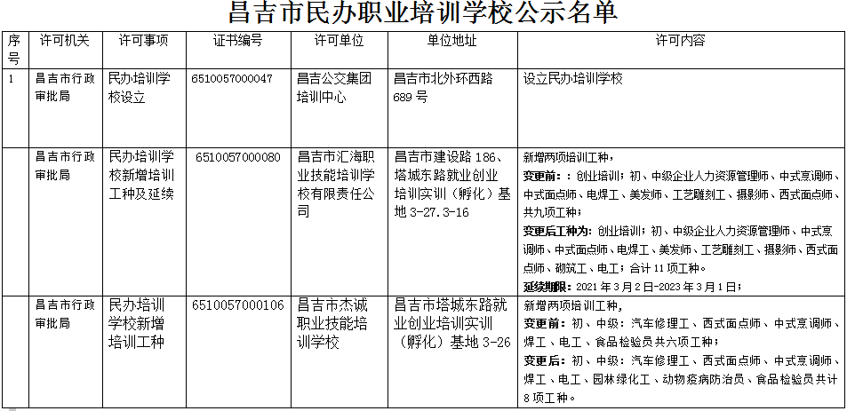 | 名 称 | 昌吉市民办职业培训学校公示名单 | ||