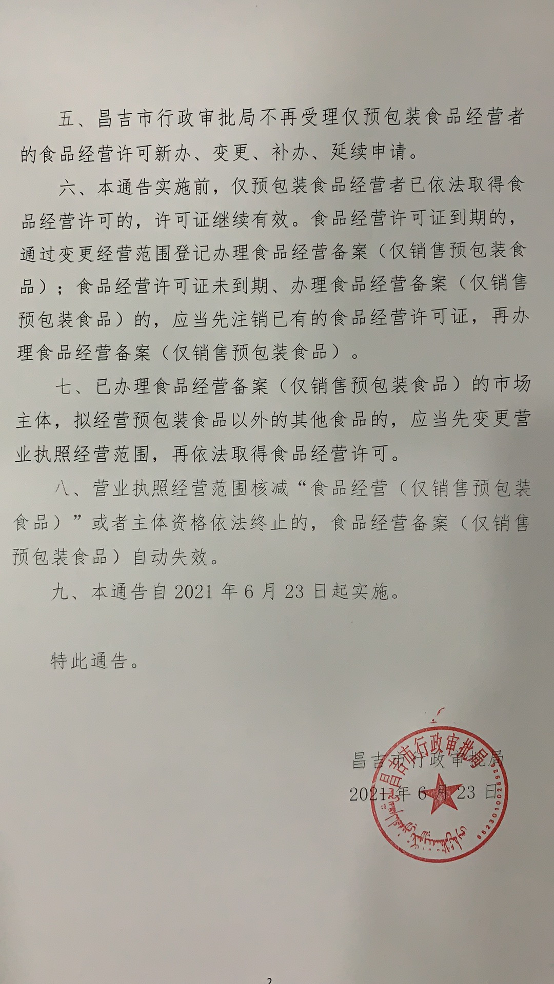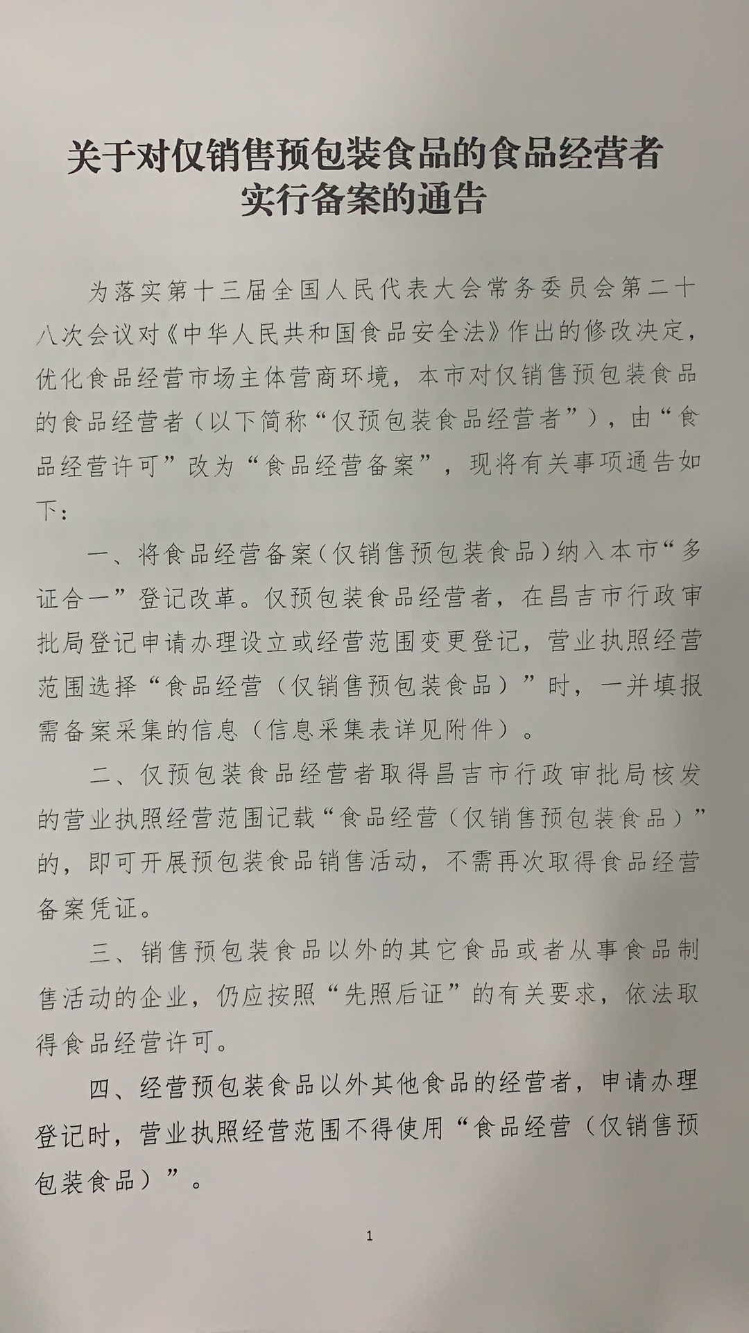 关于对仅销售预包装食品的食品经营者实行备案的通告