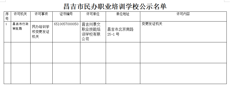 | 名 称 | 昌吉市民办职业培训学校公示名单 | ||
