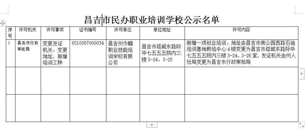 | 名 称 | 昌吉市民办职业培训学校公示名单 | ||