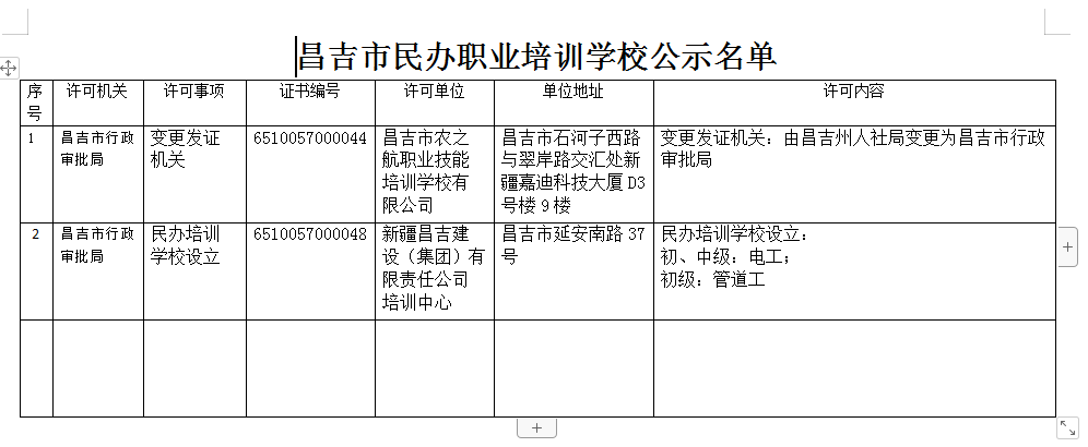 | 名 称 | 昌吉市民办职业培训学校公示名单 | ||