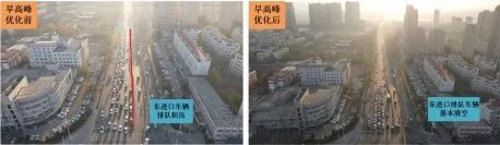 经过此次优化调整后,乌伊路与绿洲路路口早高峰时段东向西方向车辆排队长度由240米减少至90米,南向北方向车辆排队长度由390米减少至160米;晚高峰时段东向西方向车辆排队长度由310米减少至120米,早晚高峰时段四个方向排队车辆均可在1-2个周期内通过路口,路口东向西方向排队积压车辆大幅减少,南向北方向路口车辆排队溢出问题得到有效缓解,达到预期优化效果。