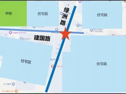 绿洲路与建国西路为十字交叉口,该路口西侧有学校,周边住宅区较多,南北进口均4车道,东西进口均为1车道,四方向均为左转+直行箭头灯。