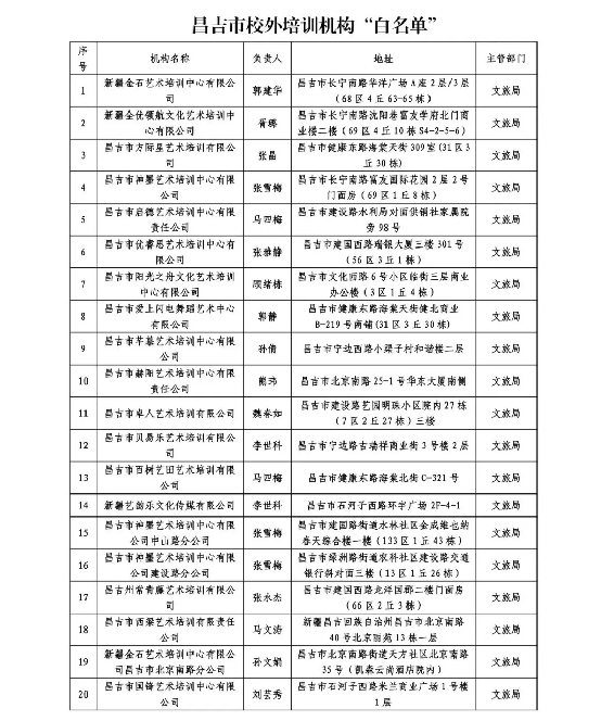 为贯彻落实国家“双减”政策,强化对校外培训机构的监督管理,坚决杜绝违规校外培训行为,切实维护广大家长学生的合法权益,现将昌吉市范围2025年校外培训机构“白名单”(即证照齐全且运行正常的培训机构)予以公布(截至2025年4月7日)。