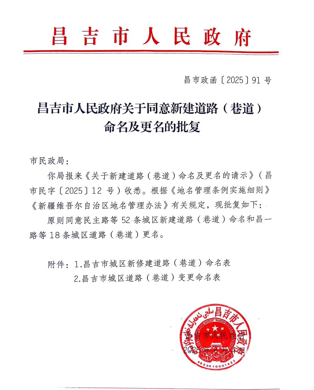 | 名 称 | 昌吉市人民政府关于同意新建道路(巷道) 命名及更名的批复 | ||