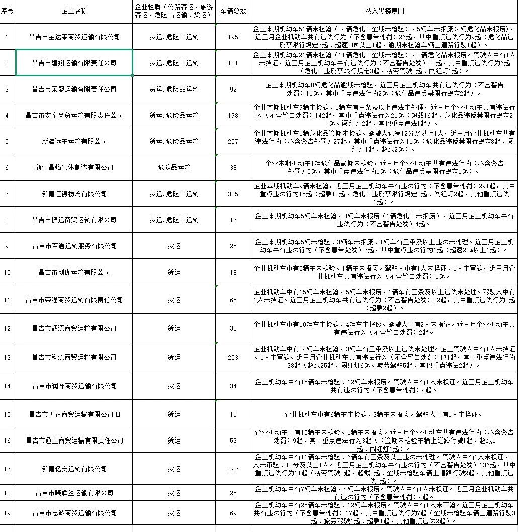 昌吉市7月“两客一危一货”企业红黑榜