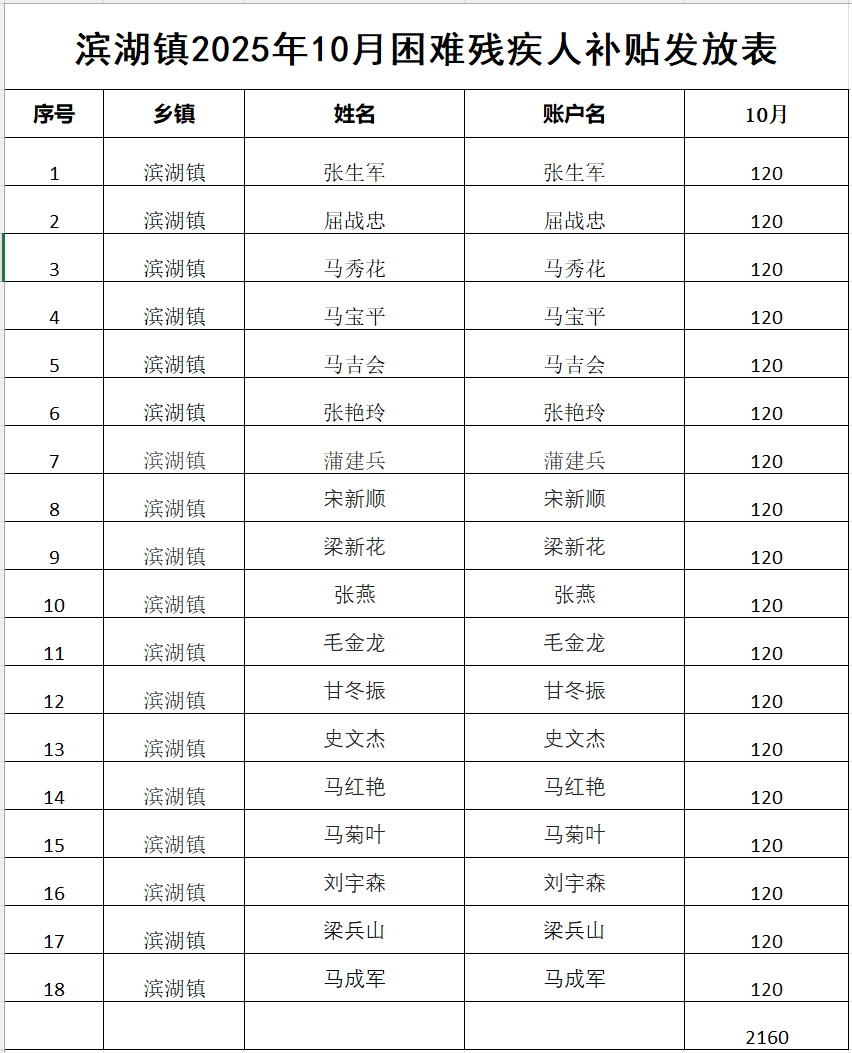 滨湖镇2025年10月困难残疾人补贴发放表