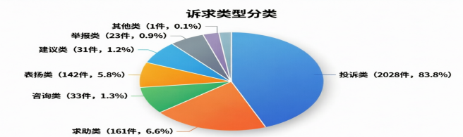 从诉求类型看:投诉类2028件,占比83.8%,主要涉及拖欠薪资、消费质量纠纷、预售服务纠纷等问题;求助类161件,占比6.6%,主要涉及生育津贴、房屋质量、物业服务等问题;表扬类142件,占比5.8%,主要反映对承办单位办事效率的肯定;咨询类33件,占比1.3%,主要涉及职业证书、医疗保险、生育津贴等事项;建议类31件,占比1.2%,主要对交通信号灯、交通护栏、警示标志设置等提出建议;举报类23件,占比0.9%,主要涉及产品质量、占用消防通道、交通违规等问题;其他类1件,占比0.1%,为地库车位管理问题。