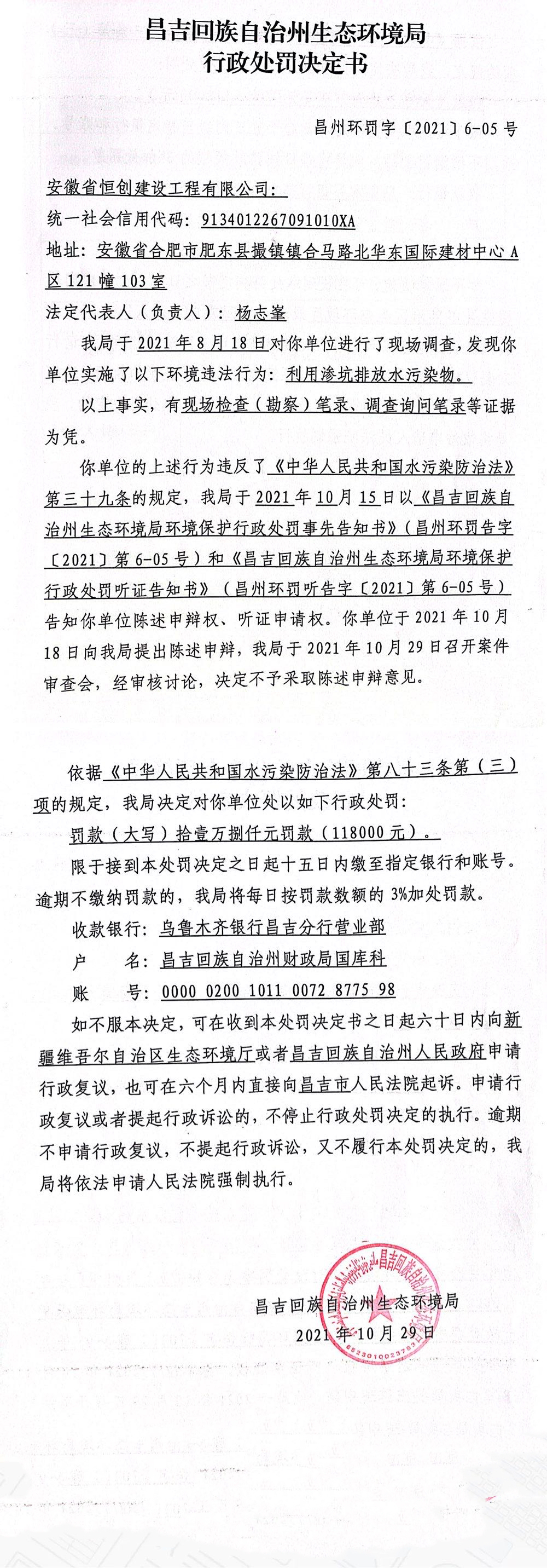 昌吉回族自治州生态环境局行政处罚决定书 (安徽省恒创建设工程有限公司)
