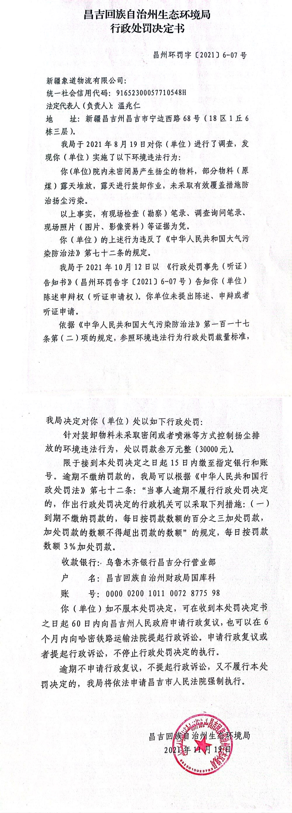 昌吉回族自治州生态环境局行政处罚决定书 (新疆象道物流有限公司)