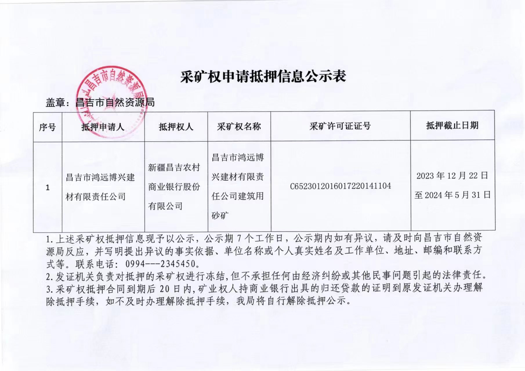 【采矿权抵押】采矿权申请抵押信息公示表-昌吉市鸿远博兴建材有限责任公司