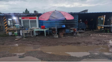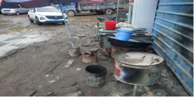 餐饮店门前有做饭使用的炉具若干、烧水壶1个、冰柜3台、桌子若干、储物柜1个。餐饮店内门后有1处插线板西北角靠近房顶处设有简易总开关,进出线接反,地面散落2段电线延长线。房间内设施设备杂乱,内部套间有冰柜、洗碗池等装置,烟感报警器已失效,屋内用电总开关无漏电保护装置,总开关一闸多机,鼓风机连接线通过2处插线板延长线连接。