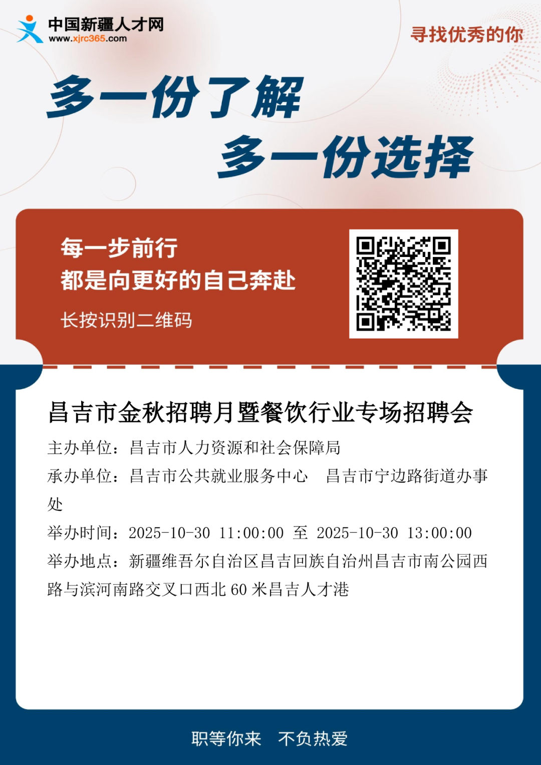 | 名 称 | 【餐饮行业专场招聘】昌吉市金秋招聘月暨餐饮行业专场招聘会来啦! | ||