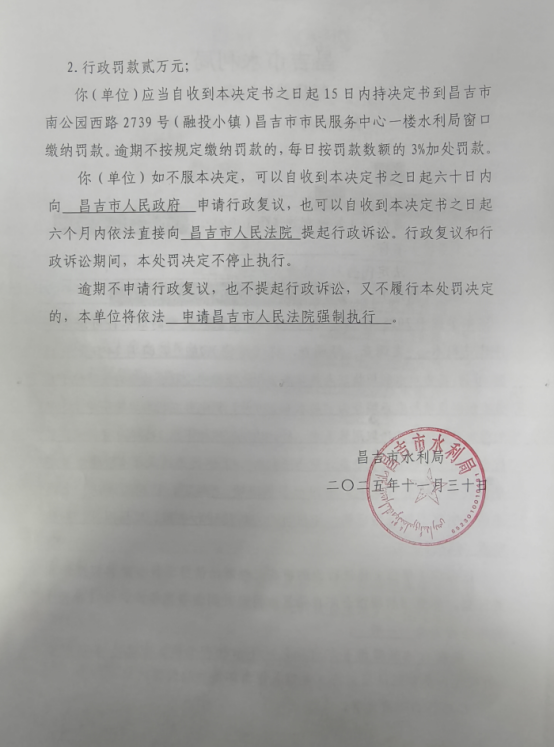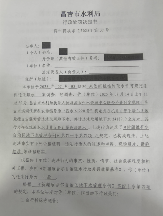 昌吉市水利局水行政处罚决定书(昌市)罚决字【2025】07号
