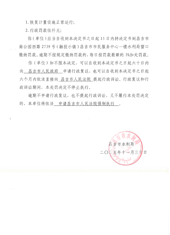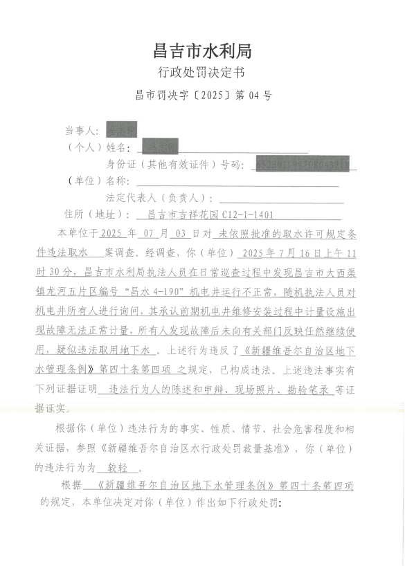 | 名 称 | 昌吉市水利局水行政处罚决定书(昌市)罚决字【2025】04号 | ||