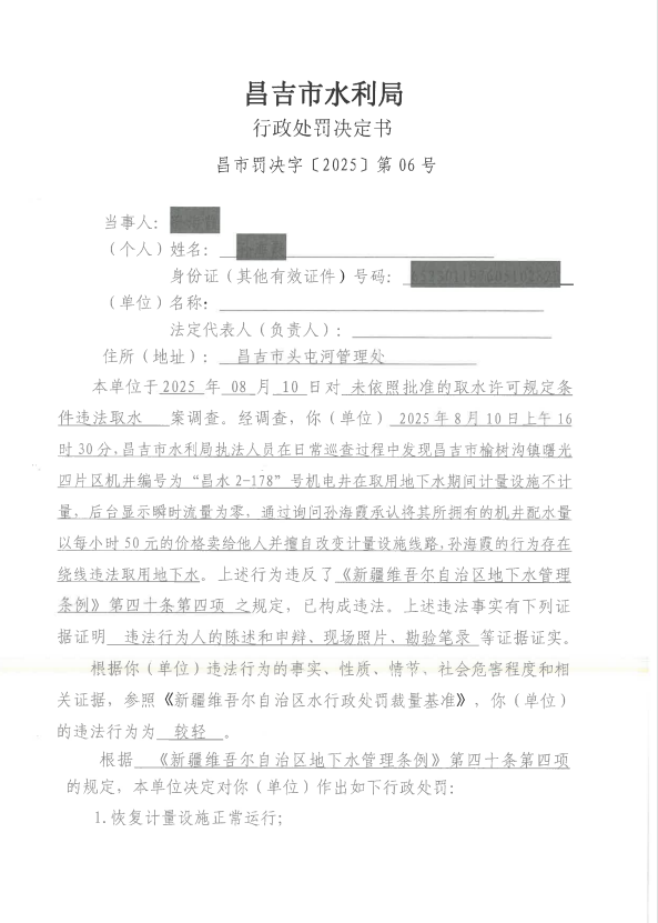 | 名 称 | 昌吉市水利局水行政处罚决定书(昌市)罚决字【2025】06号 | ||